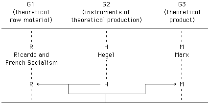 H = instruments of theoretical production, the product of the work of the Hegelian dialectic on Ricardo is then Capital = M.